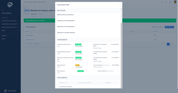 Users skills, training and competencies are tracked against their profile. Examples are fire training, GCP training, driver's license or advanced animal surgery techniques. Techniques required for a project or procedure can be set by administrators and validated across approvals.