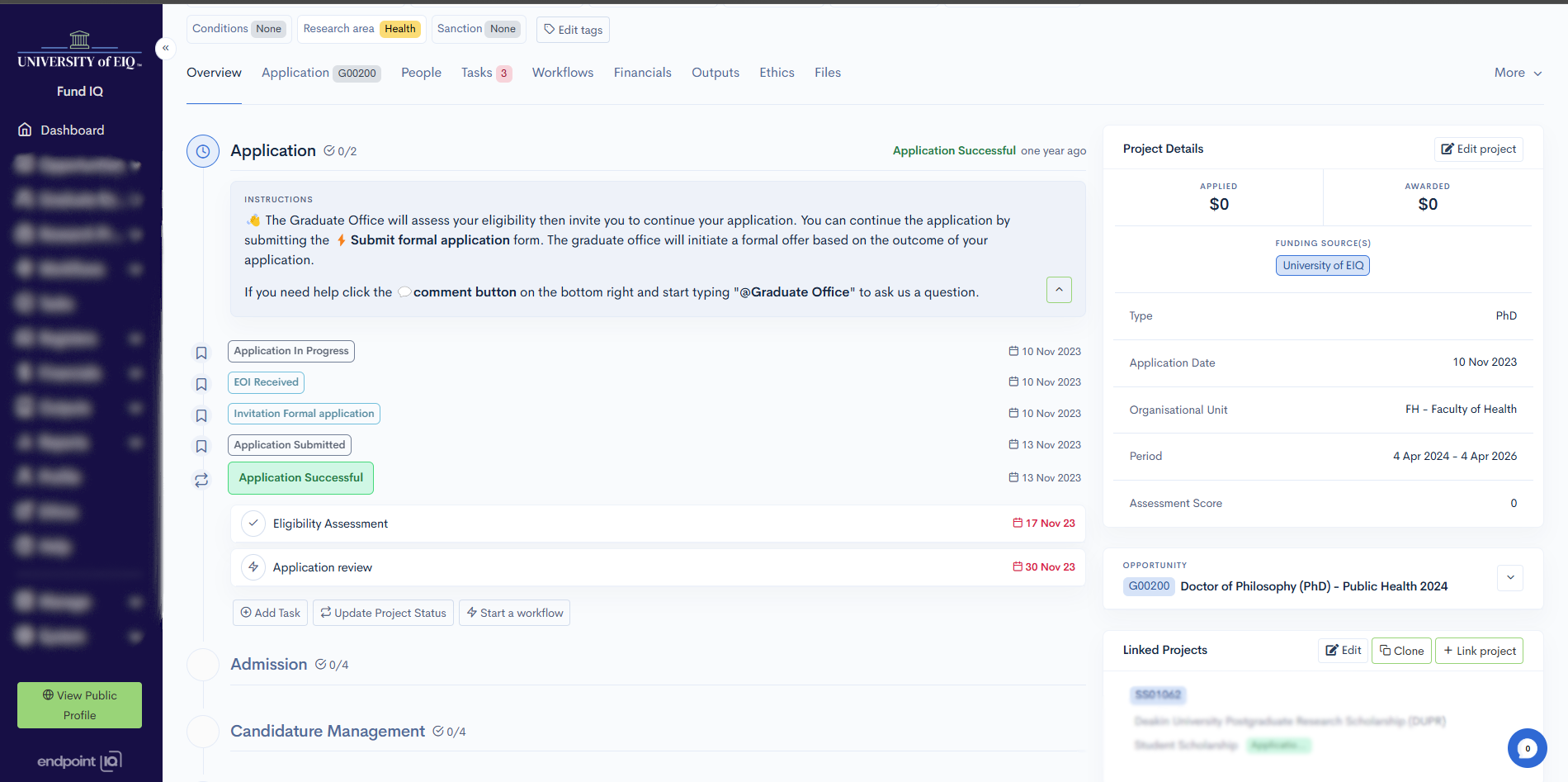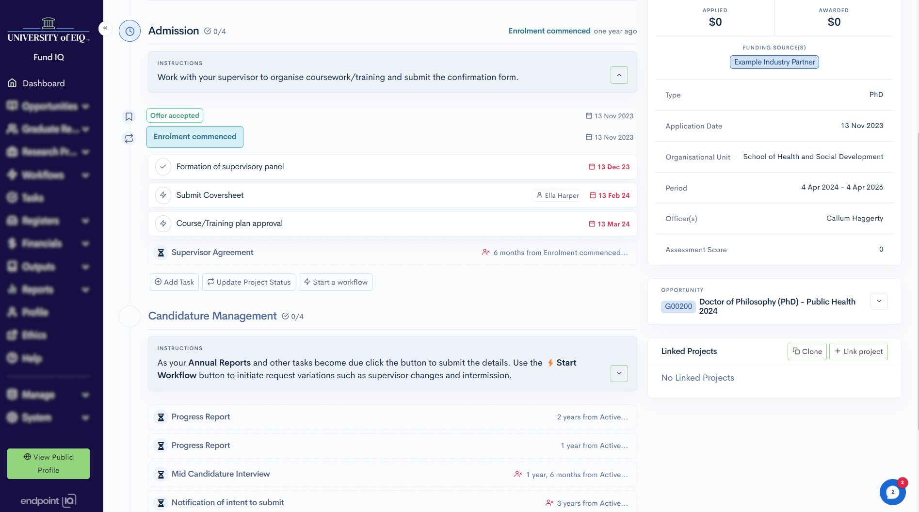 Scholar IQ is Endpoint IQ’s advanced solution for managing the entire lifecycle of Graduate Research (GR) students. Built on the robust Fund IQ platform, Scholar IQ offers unparalleled flexibility and functionality to capture every stage of the candidature journey
